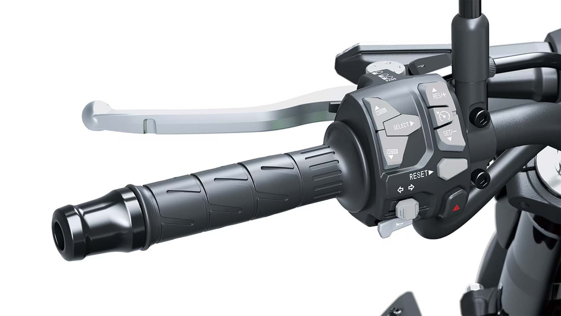 Neu sind der Aluminium-Rohrlenker und das etwas dickere Sitzpolster, mit dem die Sitzhöhe von 820 auf 830 Millimeter steigt. Optional wird ein flacheres Sitzpolster verfügbar sein, mit dem die Sitzhöhe sich auf 810 Millimeter senken lässt.